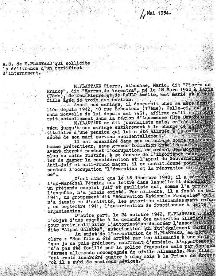 Monsieur PLANTARD, Pierre Athanase Marie, otherwise known as 'Pierre de France', otherwise known as 'Varran de Verestra', born on 18 March 1920 in Paris (7th arrondissement), son of the late Pierre and RAULO Amélie, is married and has a daughter aged about three.Before his marriage he had lived with his mother since 1942 at 10 Rue Lebouteux (17th arrondissement). His mother, who had heard nothing from him since May 1951, states that he is currently residing in the Annemasse region (Haute Savoie).Monsieur PLANTARD calls himself a journalist but, in fact, he was supported until his marriage entirely by his mother, who is entitled to a pension that was granted to her following her husband's accidental death.He is regarded by his peer group as a pretentious young man, without very much in the way of education who, from the onset of the Occupation tried, by creating more or less fictitious organisations, to acquire sufficient importance to win the consideration and support of the Government.Anti-Semitic and anti-Masonic, he announced his aim during the Occupation as being 'the purification and renewal of France'.It was in this spirit that on 16 December 1940 he sent a letter to ex-Field Marshal Pétain in which he exposed an alleged Jewish/Gaullist conspiracy which, as the subsequent enquiry showed, never actually existed. He also founded, in May 1941, a group called 'Rénovation Nationale Française', which was never active, as in September 1941 the German authorities refused to issue the necessary authorisation that would allow this organisation to function.On 24 October 1942 Monsieur PLANTARD also formed the subject of an investigation at the request of the German authorities for having requested permission to establish the association known as 'Alpha Galatès', permission for which was also refused.